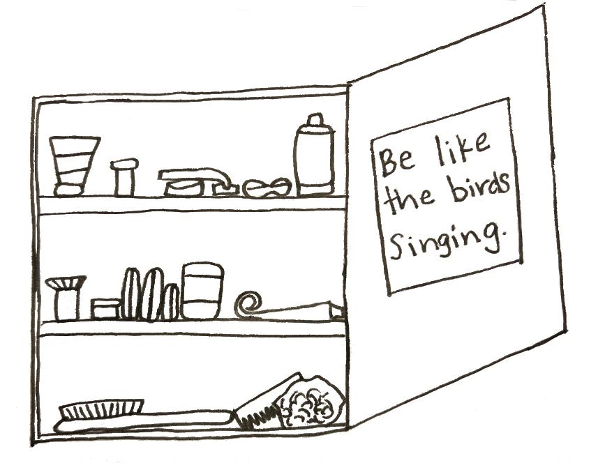 Now as a thirty-six year old, I have written “be like the birds singing” on the inside of my medicine cabinet door. All day the sparrows that live in my hedges call “I’m here, I’m here, I’m here.” Or maybe it's “This is mine. This is mine. This is mine.” They usually sound as if they are bickering. I posted it as a reminder to be noisy, to claim space, to express what I yearned to say as a little girl, and, perhaps more importantly, what I desire to say with the wisdom I’ve earned at this point in my life. It’s not the first time I’ve been trying to learn how to speak freely.